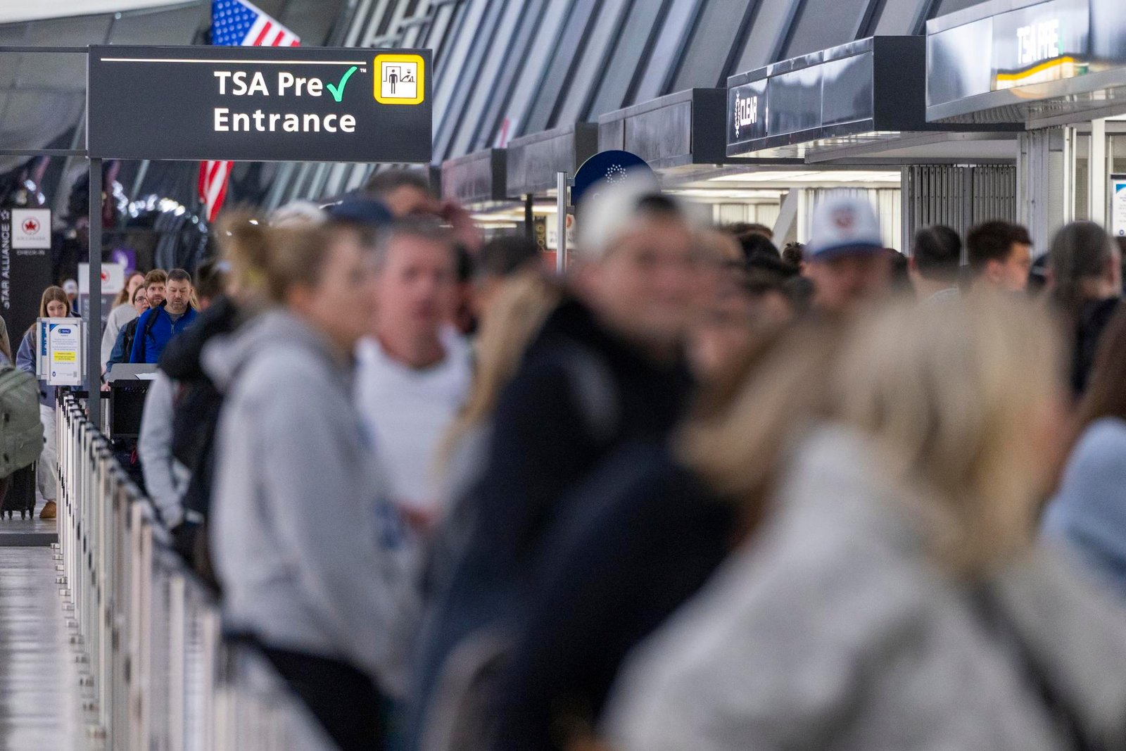 DULLES (United States), 26/03/2026.- Passengers wait in line to be screened by Transportation Security Administration (TSA) officers at Dulles International Airport in Dulles, Virginia, USA, 26 March 2026. Roughly 50,000 TSA officers are working unpaid due to a partial shutdown at the Department of Homeland Security, with historic wait times for passengers at some major airports due to increased TSA absenteeism. EFE/EPA/SHAWN THEW